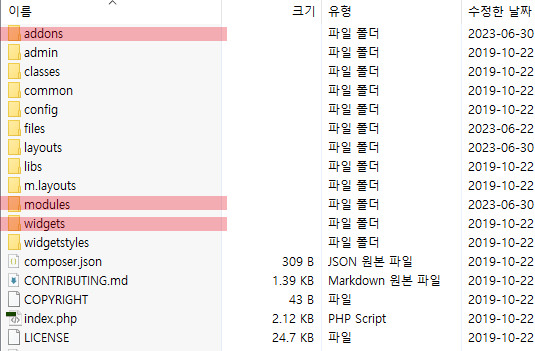 위 그림과 같이 /addons, /modules, /widgets 폴더가 보인다면, XpressEngine의 최상위(root) 디렉토리입니다.