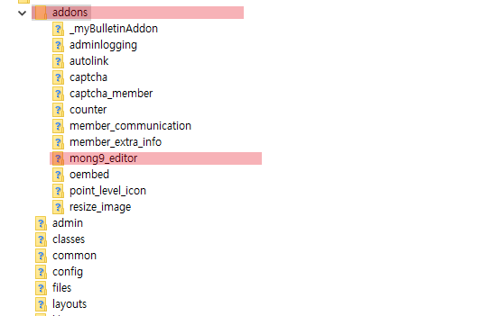 3. /addons 폴더에, mong9_editor 폴더를 업로드합니다.