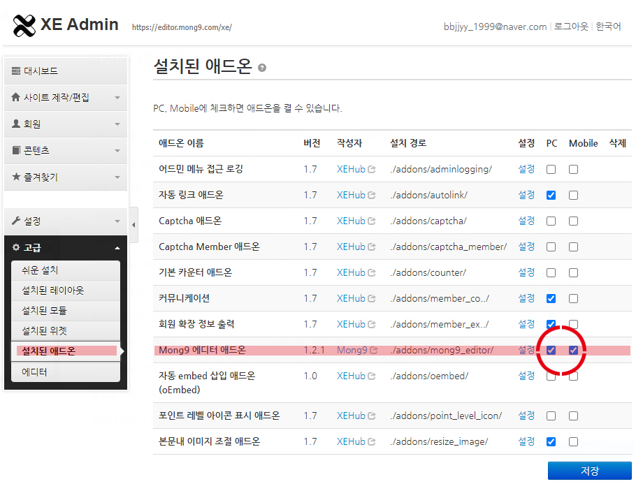 PC,Mobile둘 다 활성화 체크 - 저장 버튼을 클릭하여, 활성화를 저장